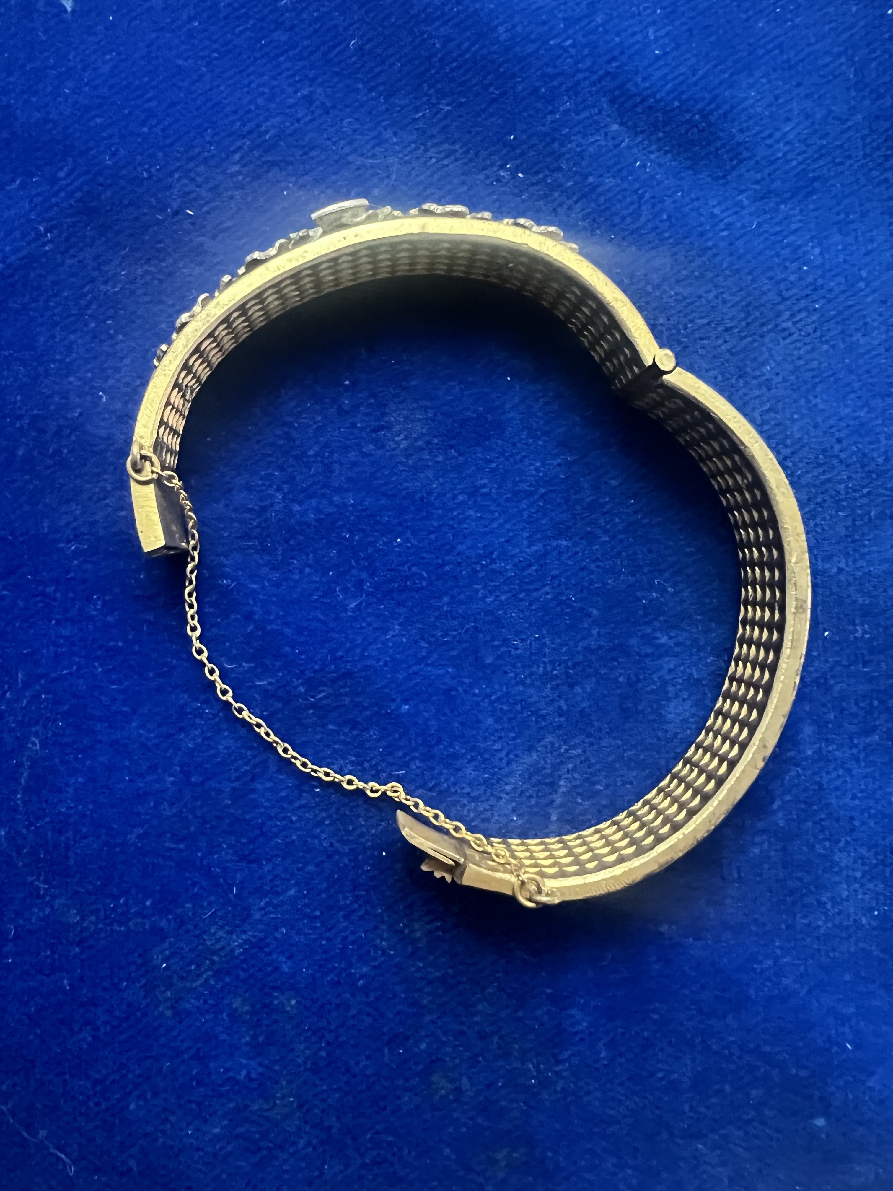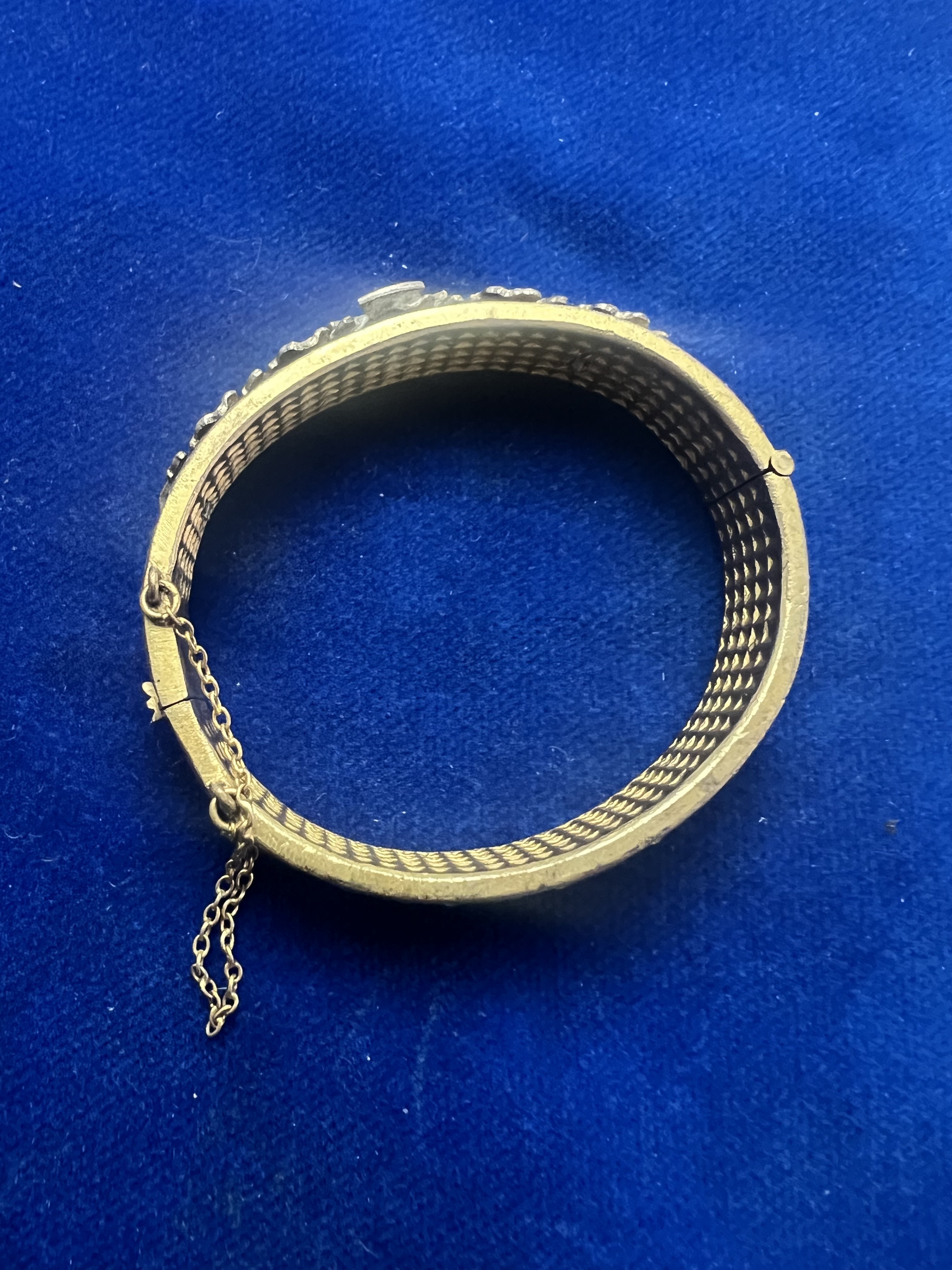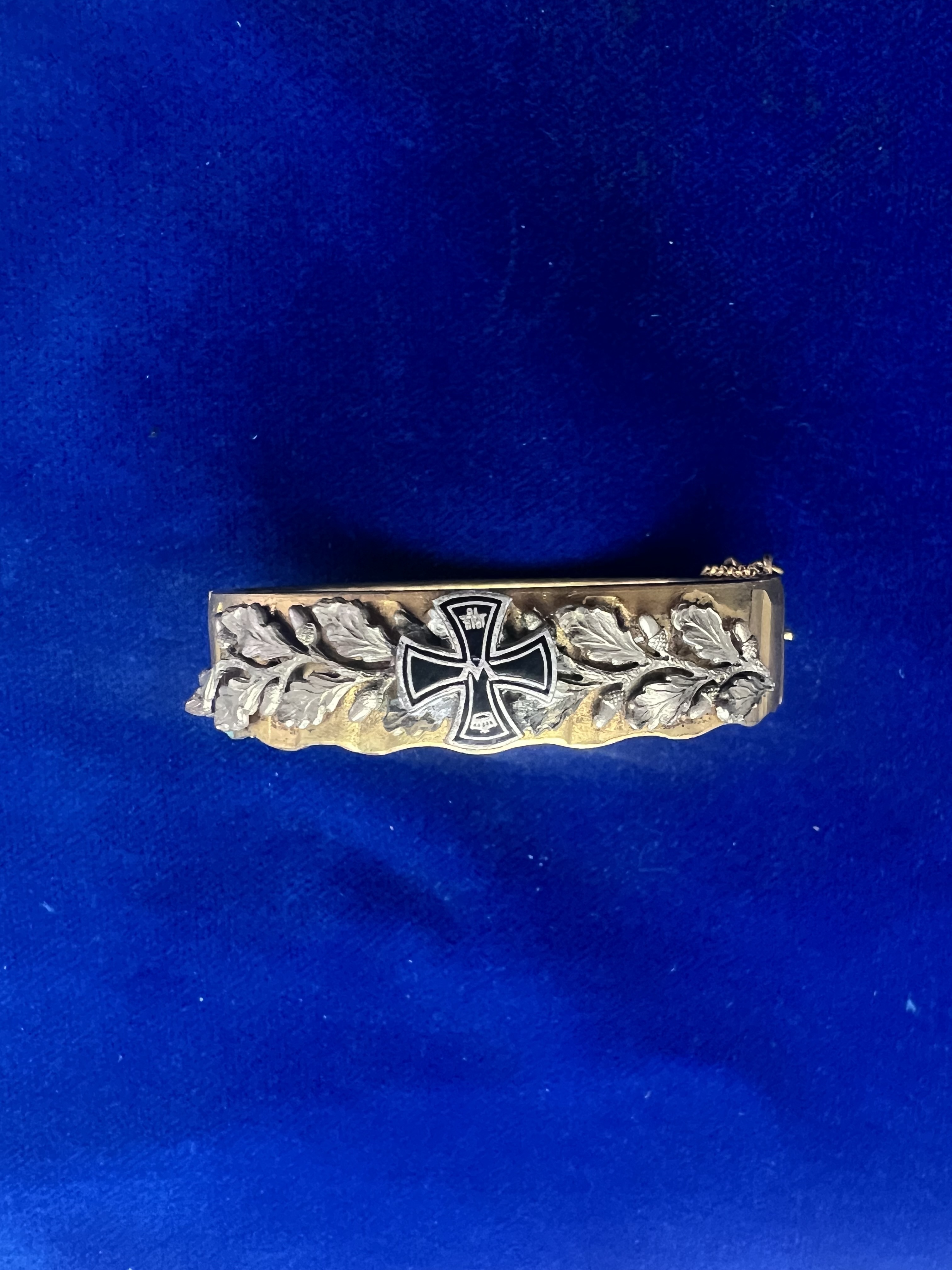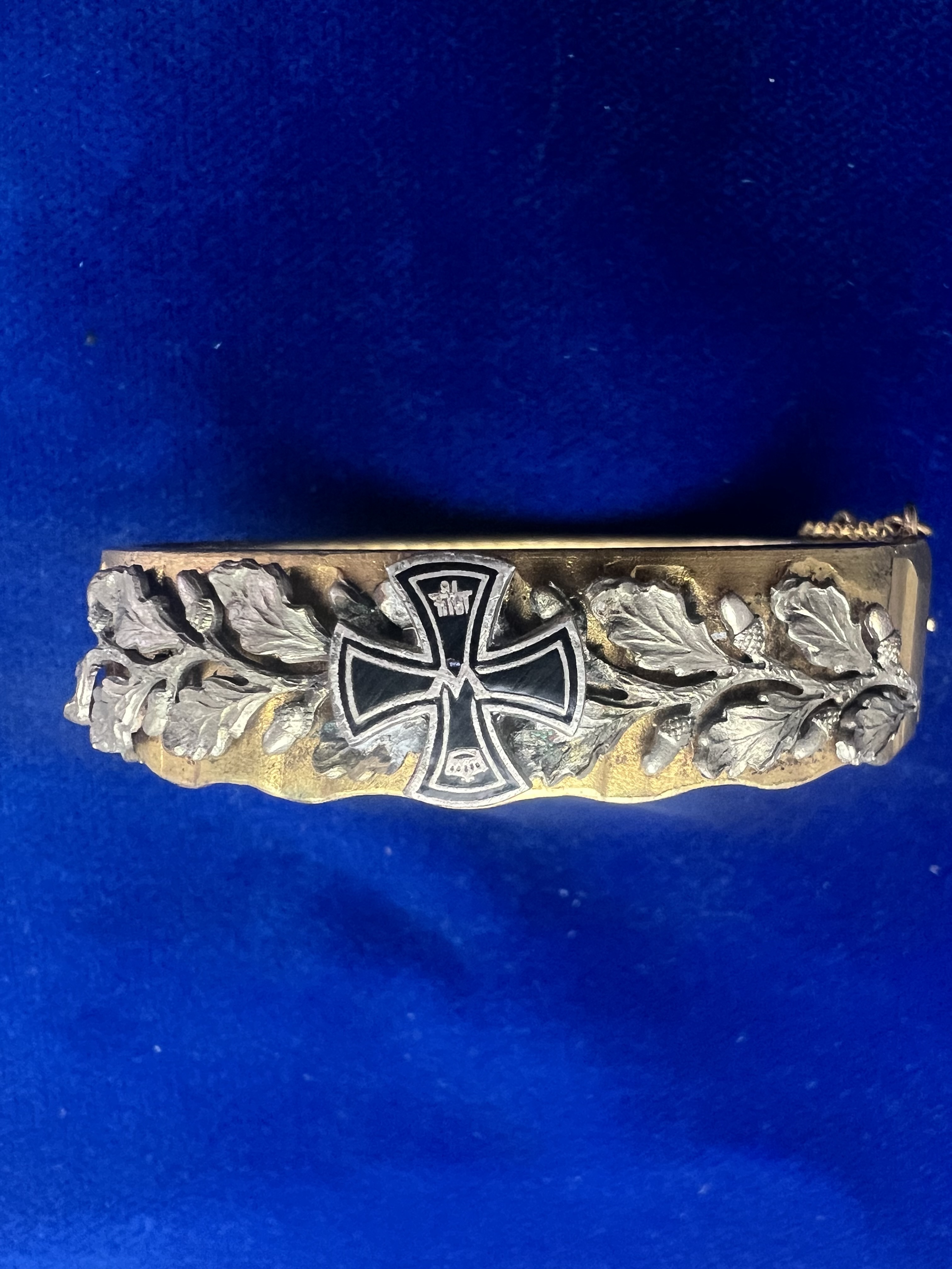 Patriotischer Armreif aus dem 1. Weltkrieg. Fertigung aus einem Granatführungsring aus Messing. Mit Eichenlaub und emailliertem Eisernen Kreuz. Mit Sicherungskette